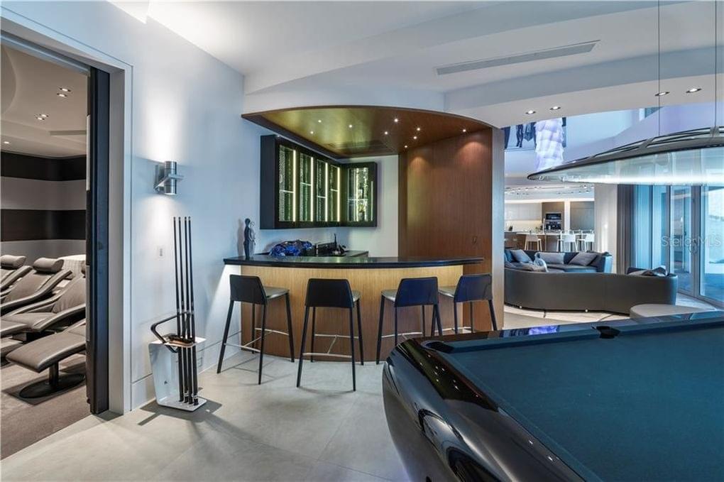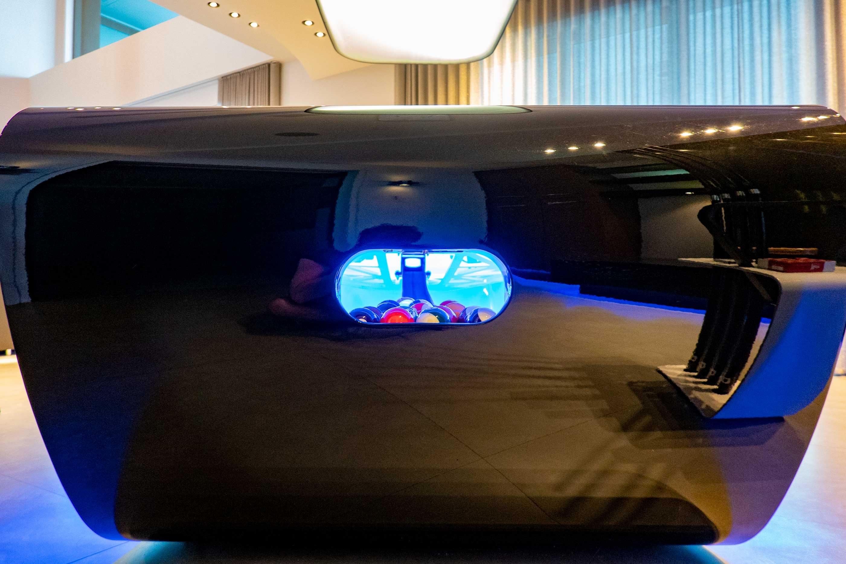 This design billiard table is composed of a rounded structure including a metal frame and a slate. The basin brings a touch of originality and highlights the ball drops.